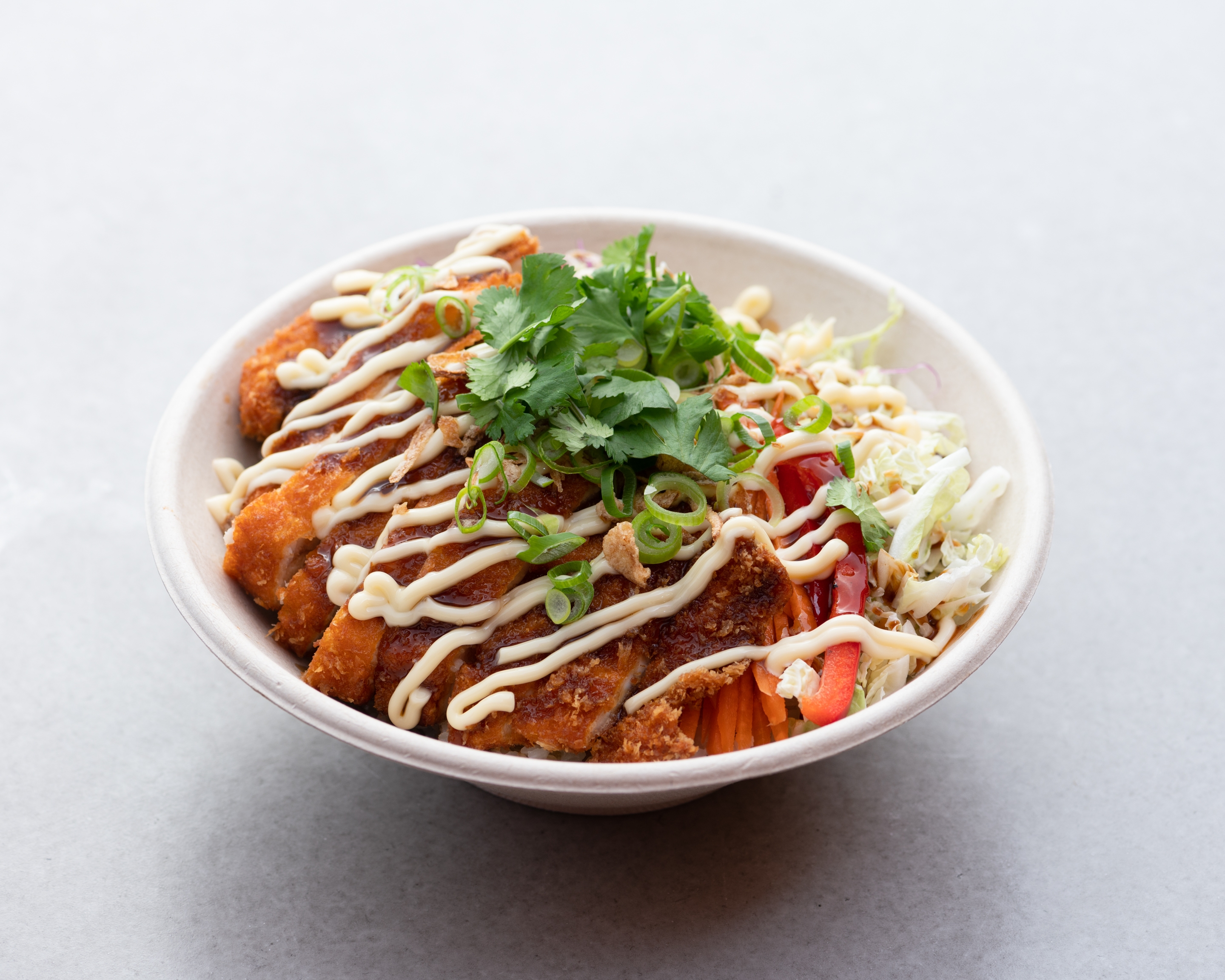 Katsu chicken on mixed sushi rice with house slaw*, katsu sauce, Japanese mayo; garnished w/coriander, spring onion & fried shallots. *Slaw contains sesame seeds
