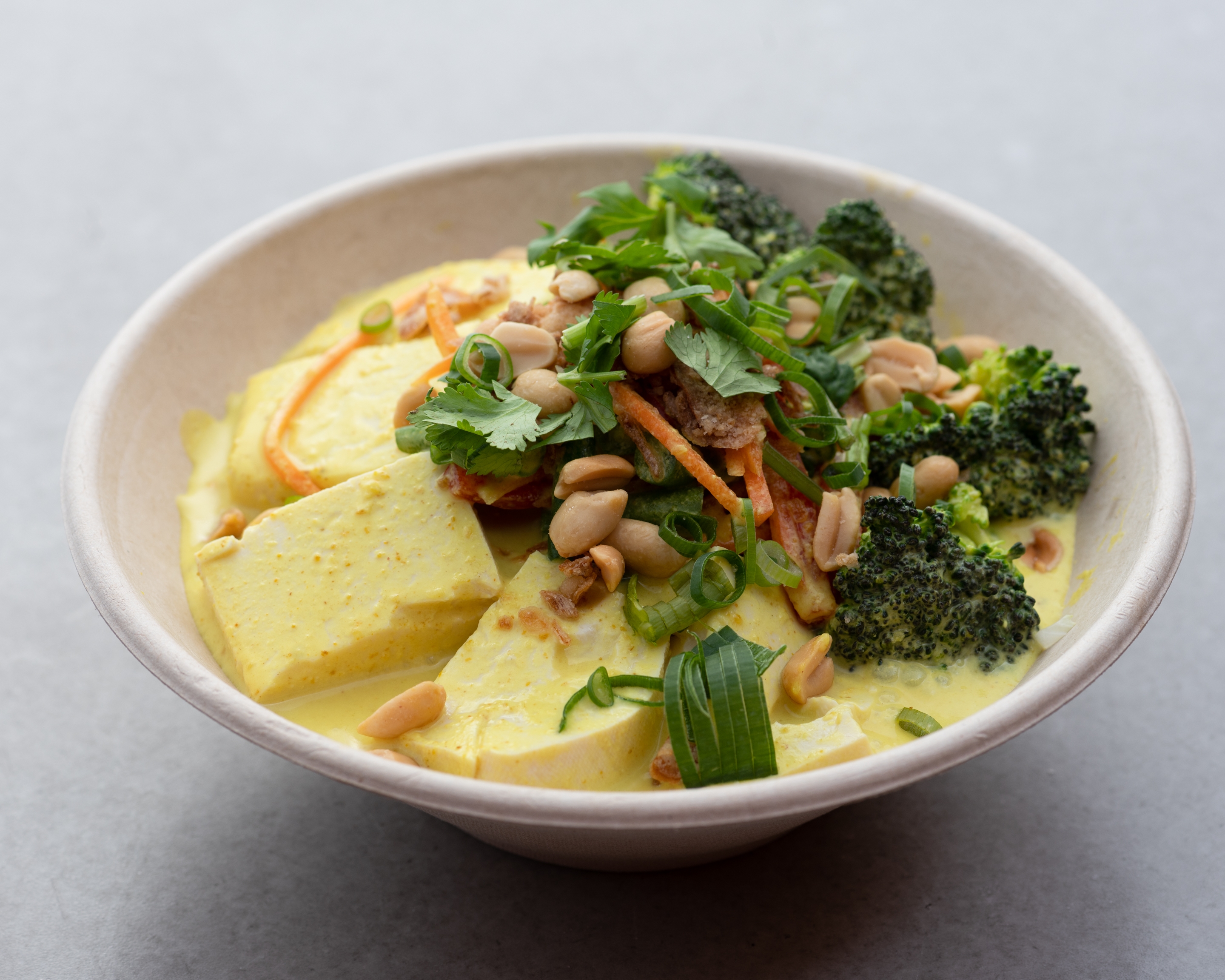 Tofu in our veggie curry with white sushi rice, broccoli, green beans, carrots, wom bok; garnished w/ coriander, spring onion, fried shallots & peanuts