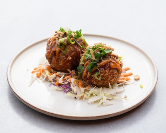 Deep-fried rice ball with katsu sauce and spicy mayo; sprinkled with sesame seeds and garnished with coriander. *Served with slaw which contains sesame seeds