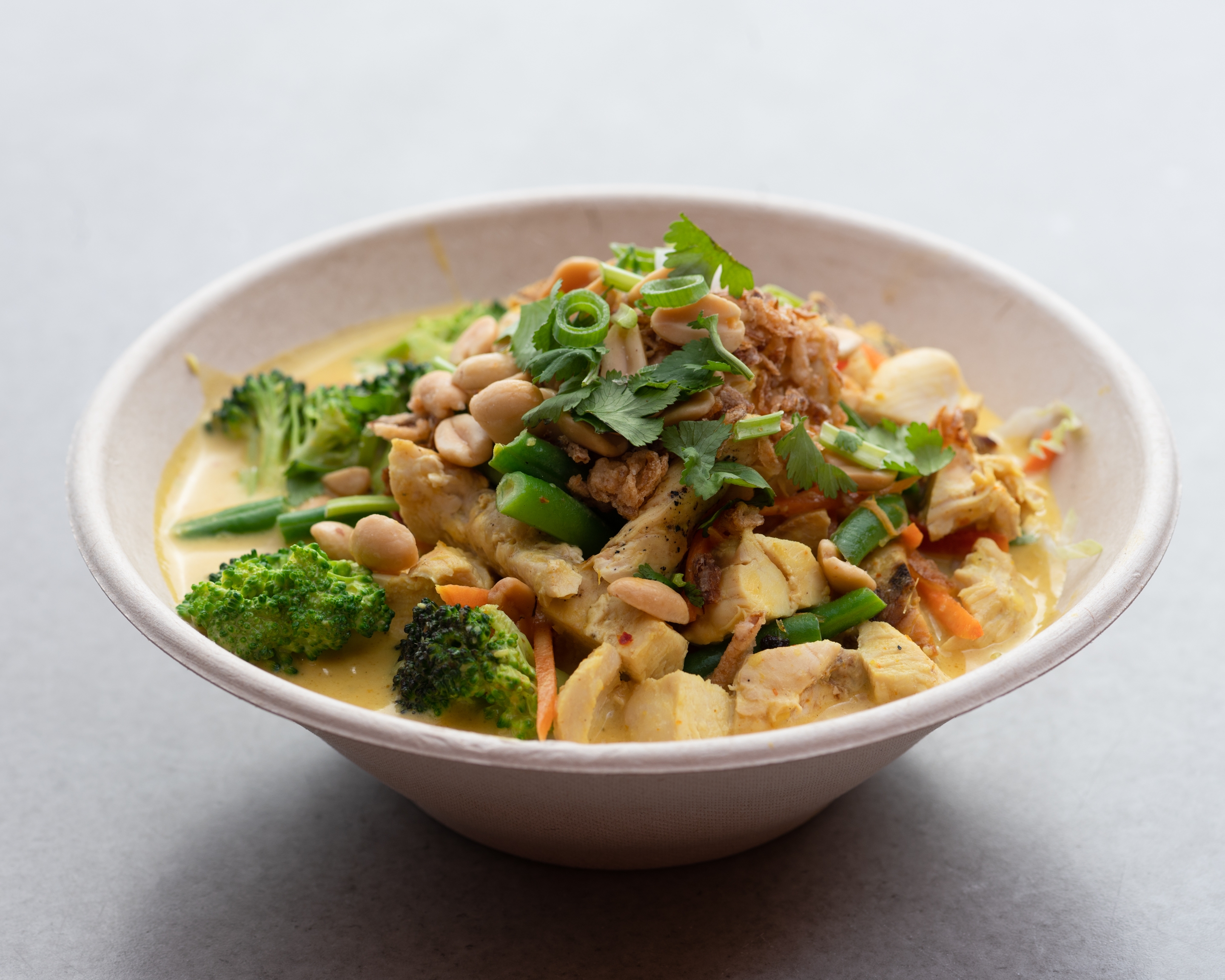 chicken breast in our coconut curry with white sushi rice, broccoli, green beans, carrots, wom bok; garnished/ coriander, spring onion, fried shallots & peanuts.
